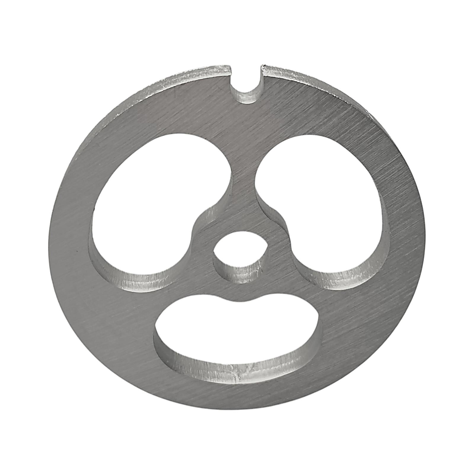 Решетка предназначена для переработки мяса крупной фракцией, обеспечивая нарезку кусочками. Устанавливается на шнек мясорубки, располагаясь между режущим ножом и прижимной гайкой.
