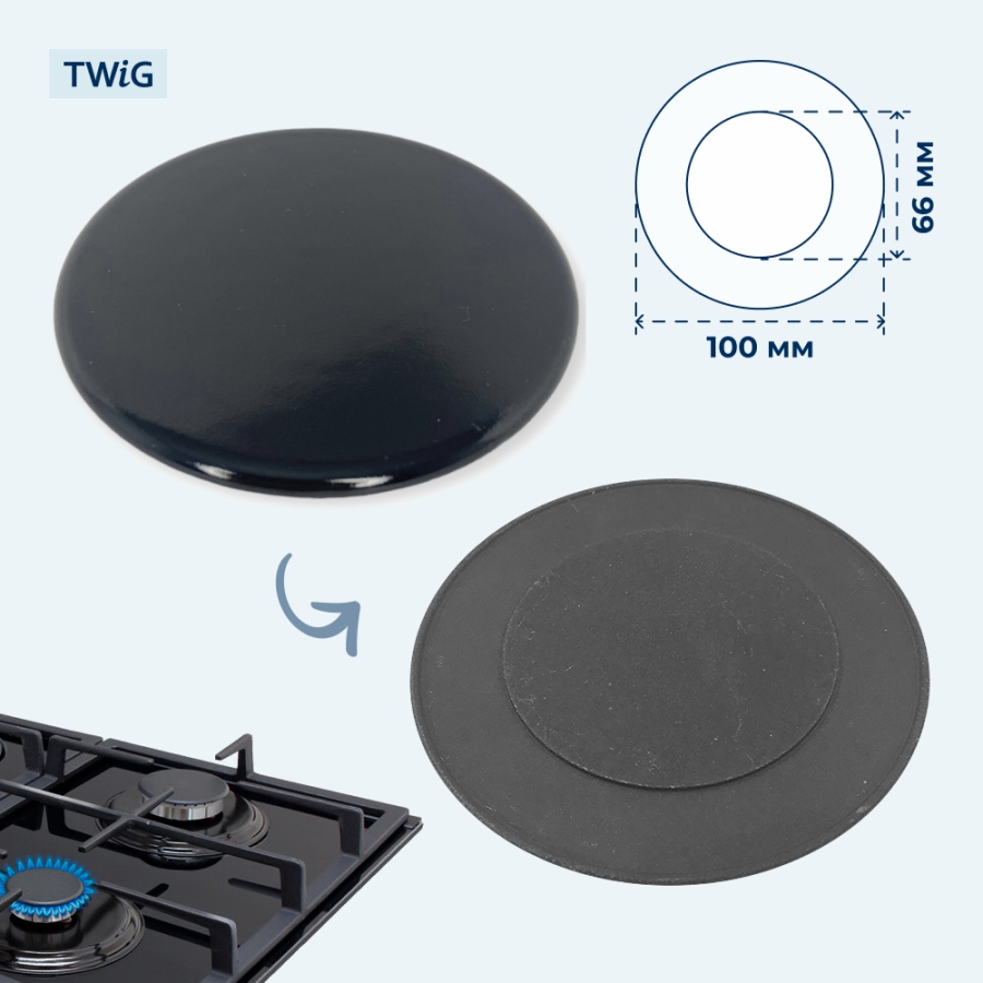 Крышка рассекателя средней конфорки для газовой плиты Midea имеет наружный диаметр 100 мм, внутренний диаметр 66 мм и толщину 3 мм. Изготовлена из металла и покрыта эмалью с глянцевым финишем, она обеспечивает равномерное распределение пламени, что способствует оптимальному нагреву посуды.