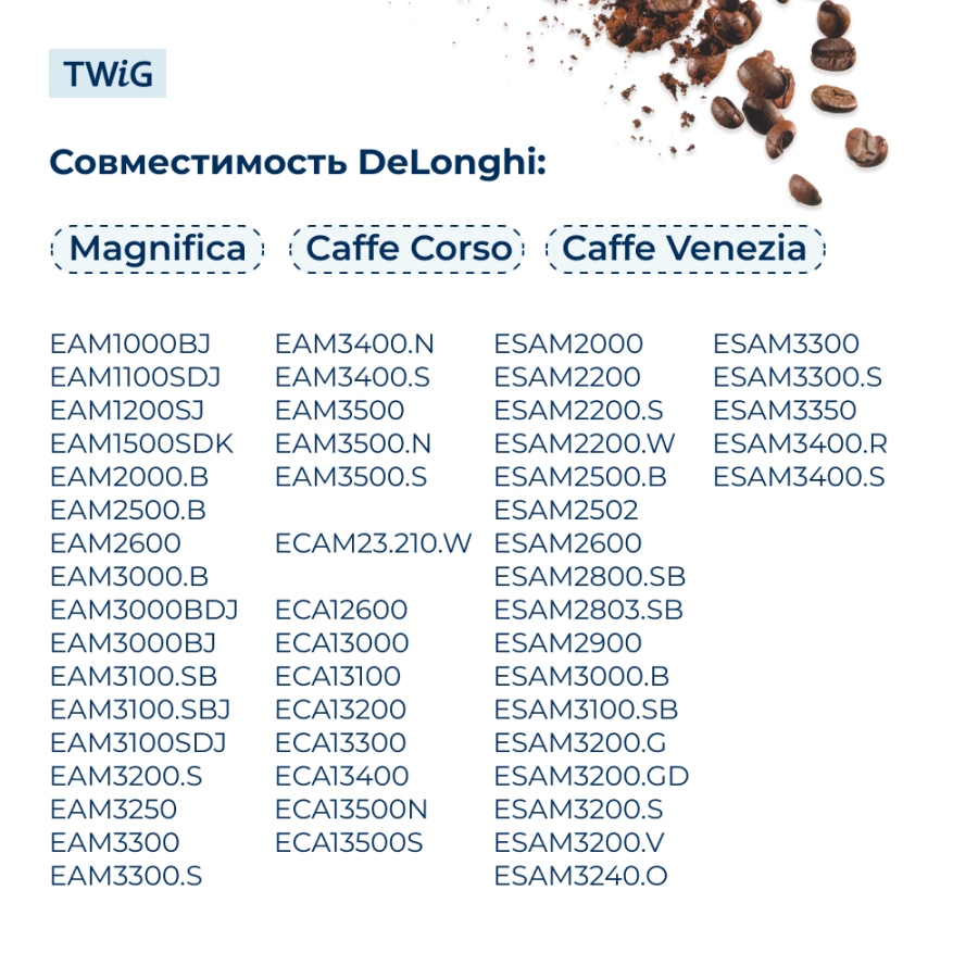 Разработанным специально для кофемашин DeLonghi серии Caffe Corso, Caffe Venezia, Magnifica и Magnifica Elegance. Обеспечивает бесперебойную подачу свежего кофе и добавляет удобства к вашему утреннему ритуалу.