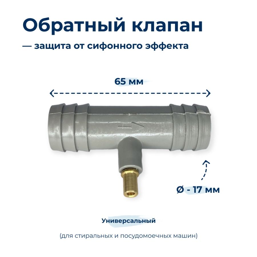 Клапан имеет следующие параметры: длина - 65 мм, внешний диаметр - 17 мм, внутренний диаметр - 15 мм. Соединение DWH900UN прекрасно подходит для стиральных и посудомоечных машин. Кроме того, он является универсальным и может заменить детали с кодами 012677 и cod458. Защитите свою стиральную или посудомоечную машину от сифонного эффекта с помощью антисифонного клапана арт. DWH900UN.