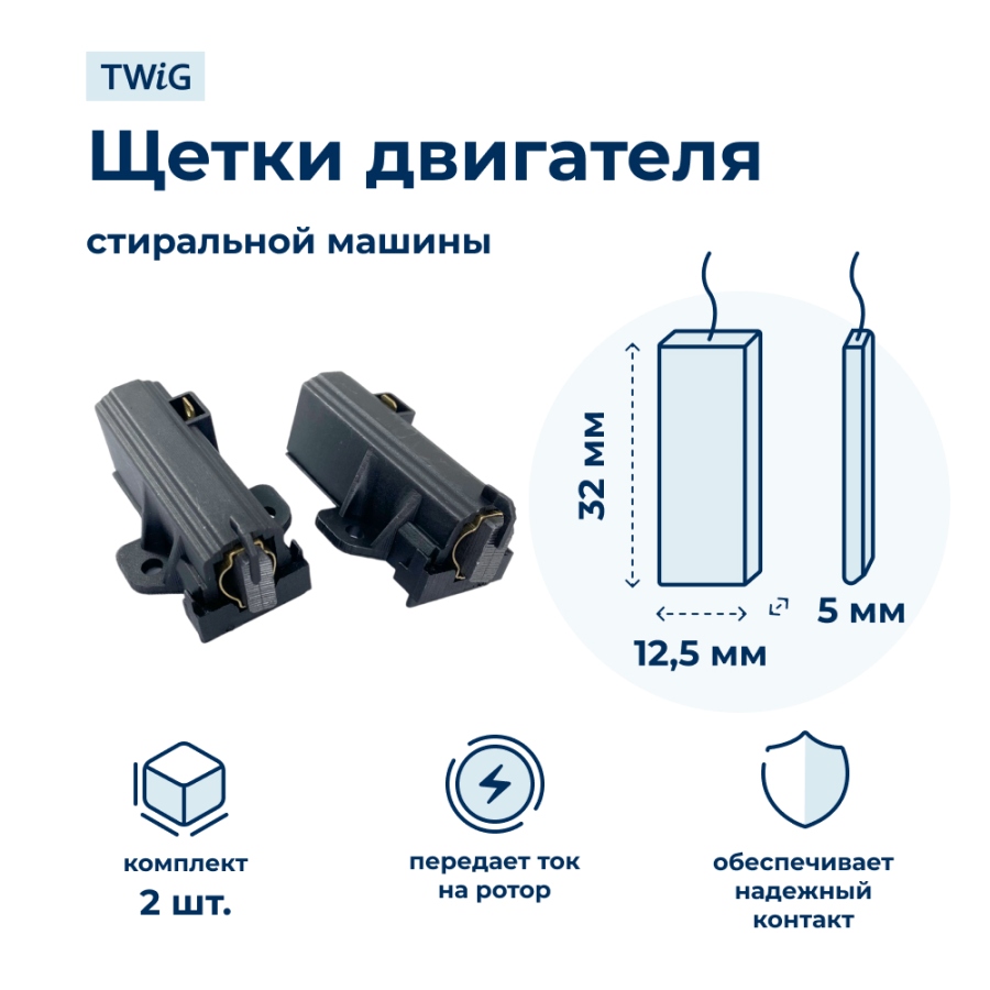 Щетки электродвигателя стиральной машины 5x12,5x32 мм - это угольно-графитовые детали, которые обеспечивают электрический контакт между якорем и коллектором двигателя. Щетки изнашиваются со временем и требуют замены, чтобы поддерживать нормальную работу стиральной машины. Данный вариант щеток поставляется с корпусом.