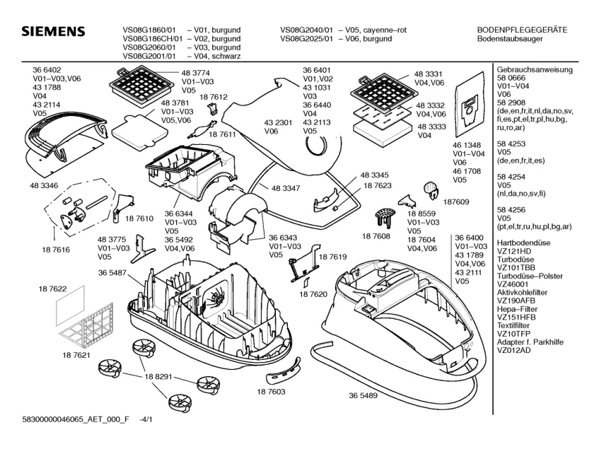 Запчасти для Siemens VS08G1860/01 (58300000046065_aet_000_f_01)