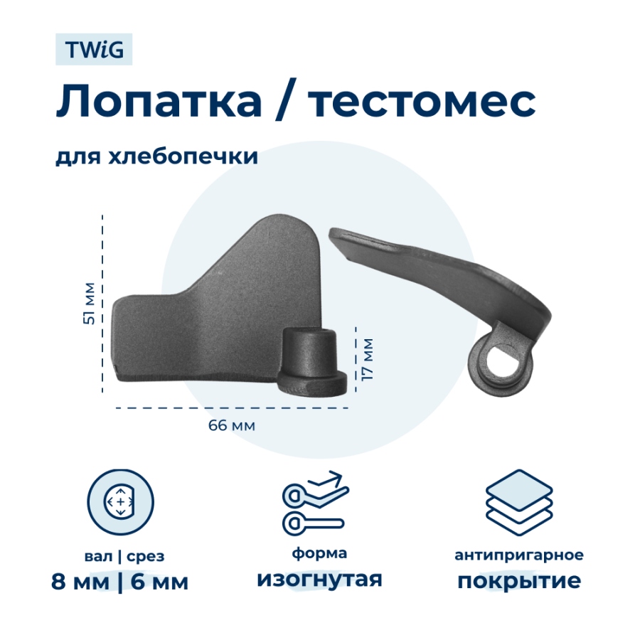 Основные характеристики: длина — 66 мм, высота — 51 мм, высота посадки — 17 мм, размер посадочного отверстия — 6×8 мм. Материал — алюминий с антипригарным покрытием. Выгнутая форма позволяет эффективно перемешивать ингредиенты, не повреждая ведро хлебопечки.