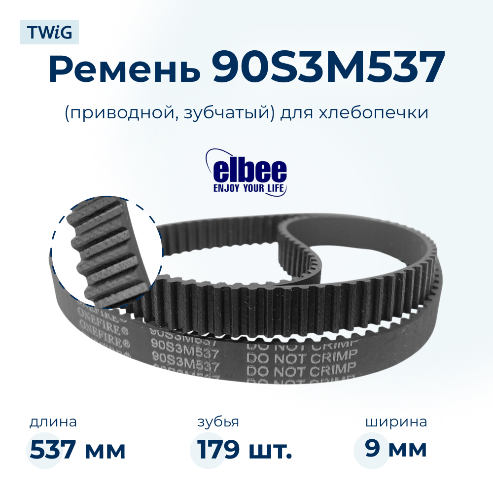 Зубчатый ремень для хлебопечки Elbee 24001 с маркировкой 90S3M537 предназначен для передачи вращения от двигателя к механизму замешивания теста.