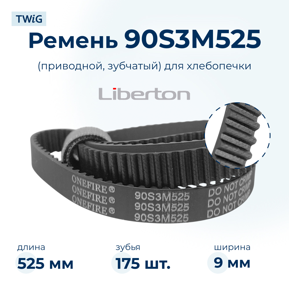 Изготовленный из прочной резины, ремень отличается устойчивостью к износу и долговечностью. Его параметры: длина – 525 мм, ширина – 9 мм, количество зубьев – 175, шаг зуба – 3 мм, маркировка – 90S3M525.