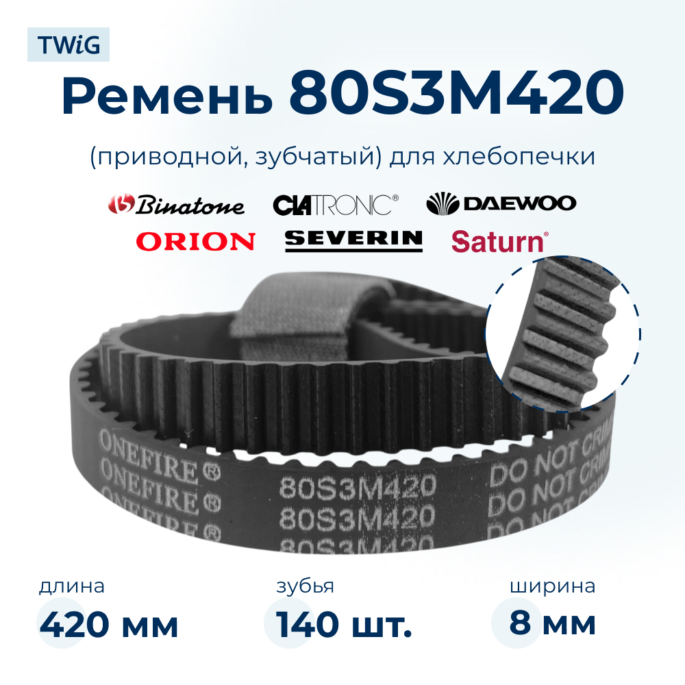 Зубчатый приводной ремень для хлебопечки 80S3M420 передает крутящий момент от двигателя к механизму замеса. Маркировка «80S3M420» или «420-3M-8» указывает на ширину 8 мм, шаг зубьев 3 мм и длину 420 мм. Изготовлен из износостойкой резины, рассчитанной на интенсивную нагрузку. Правильный выбор ремня обеспечивает устойчивое вращение шкивов и равномерное перемешивание теста.