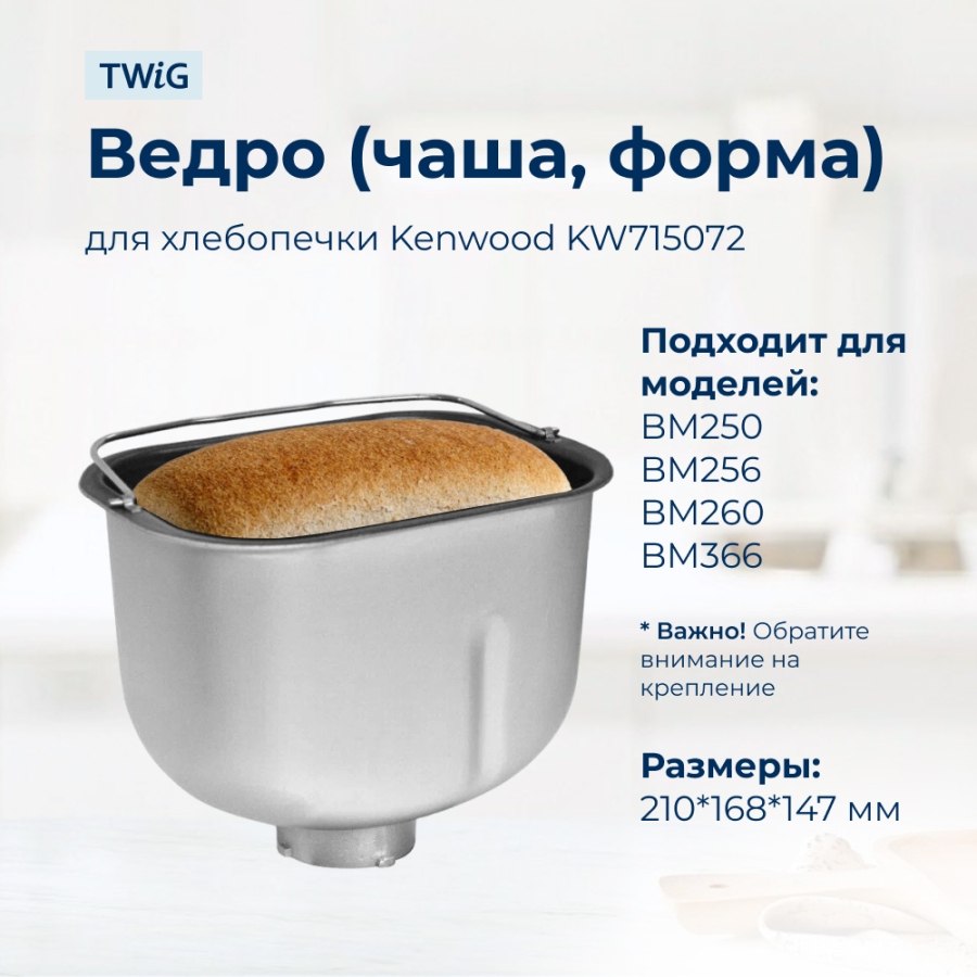 Ведро для хлебопечки Kenwood (арт. KW715072) предназначено для моделей BM250, BM256, BM260, BM366. Прямоугольная форма обеспечивает равномерное выпекание хлеба весом до 1 кг.