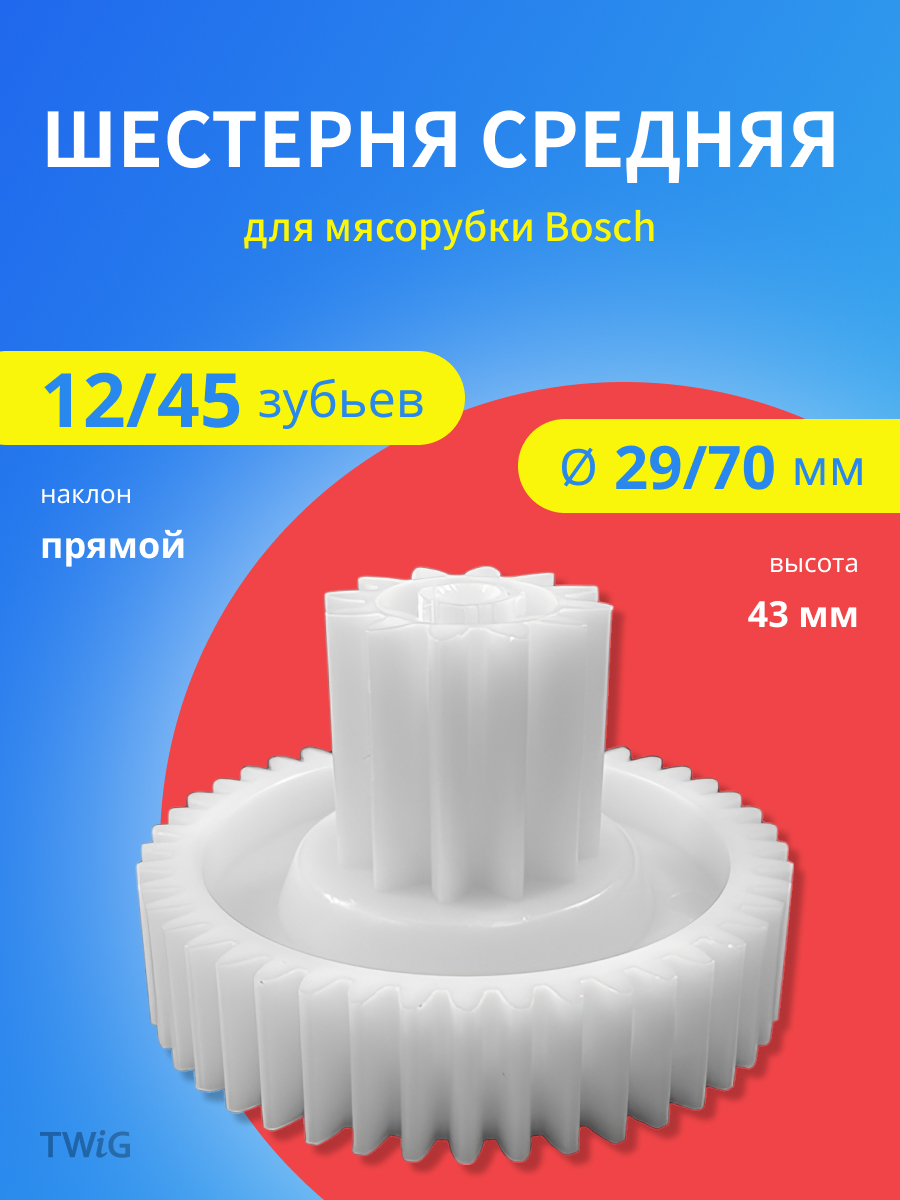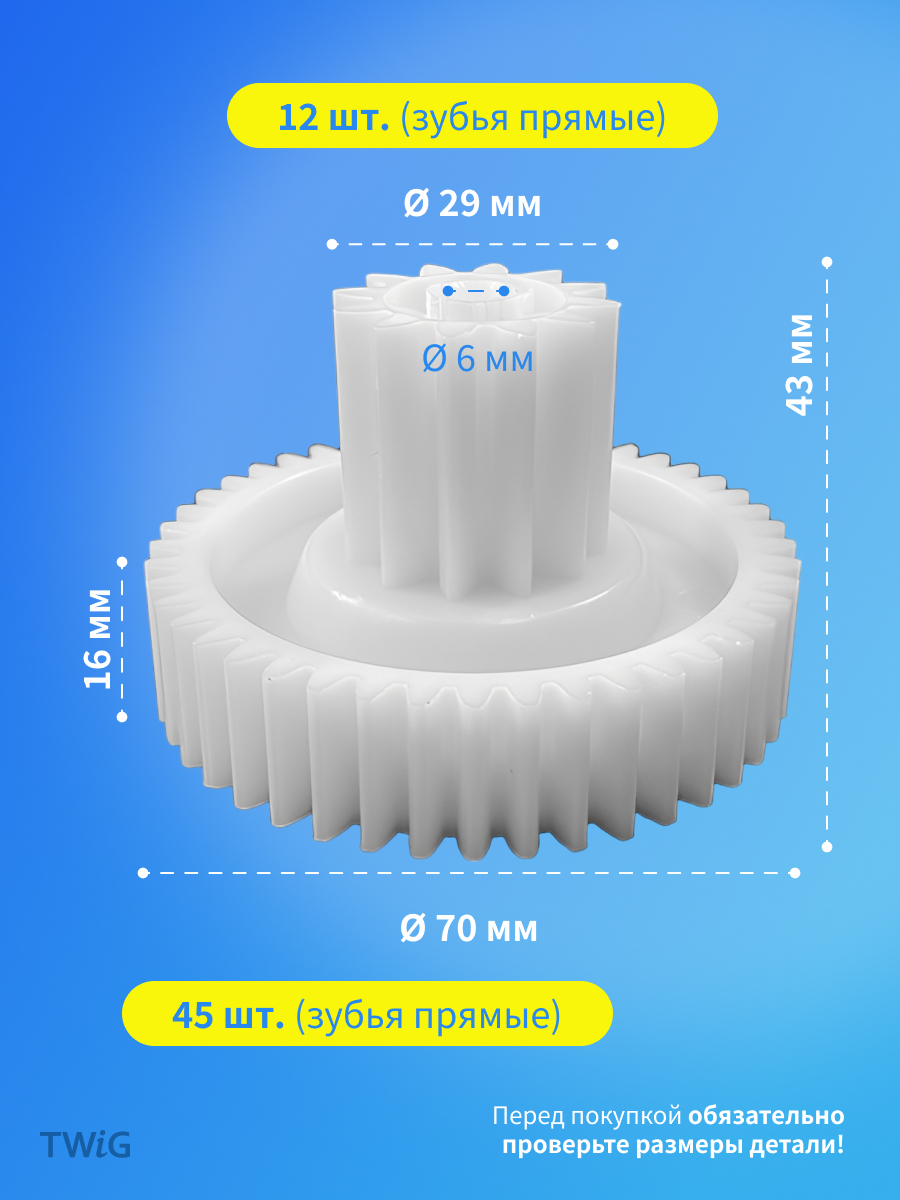 Шестерня выполнена из прочного пластика, устойчивого к механическим нагрузкам. Диаметр зубчатых венцов составляет 29 мм (малая шестерня) и 70 мм (большая), общая высота — 43 мм, высота нижнего ряда — 16 мм. Количество зубьев — 12 на малом и 45 на большом диаметре, с прямым профилем, что обеспечивает надежное зацепление и минимальный износ при длительной эксплуатации. Внутренний диаметр посадочного отверстия — 6 мм, рассчитан на стандартный вал мясорубок Bosch.