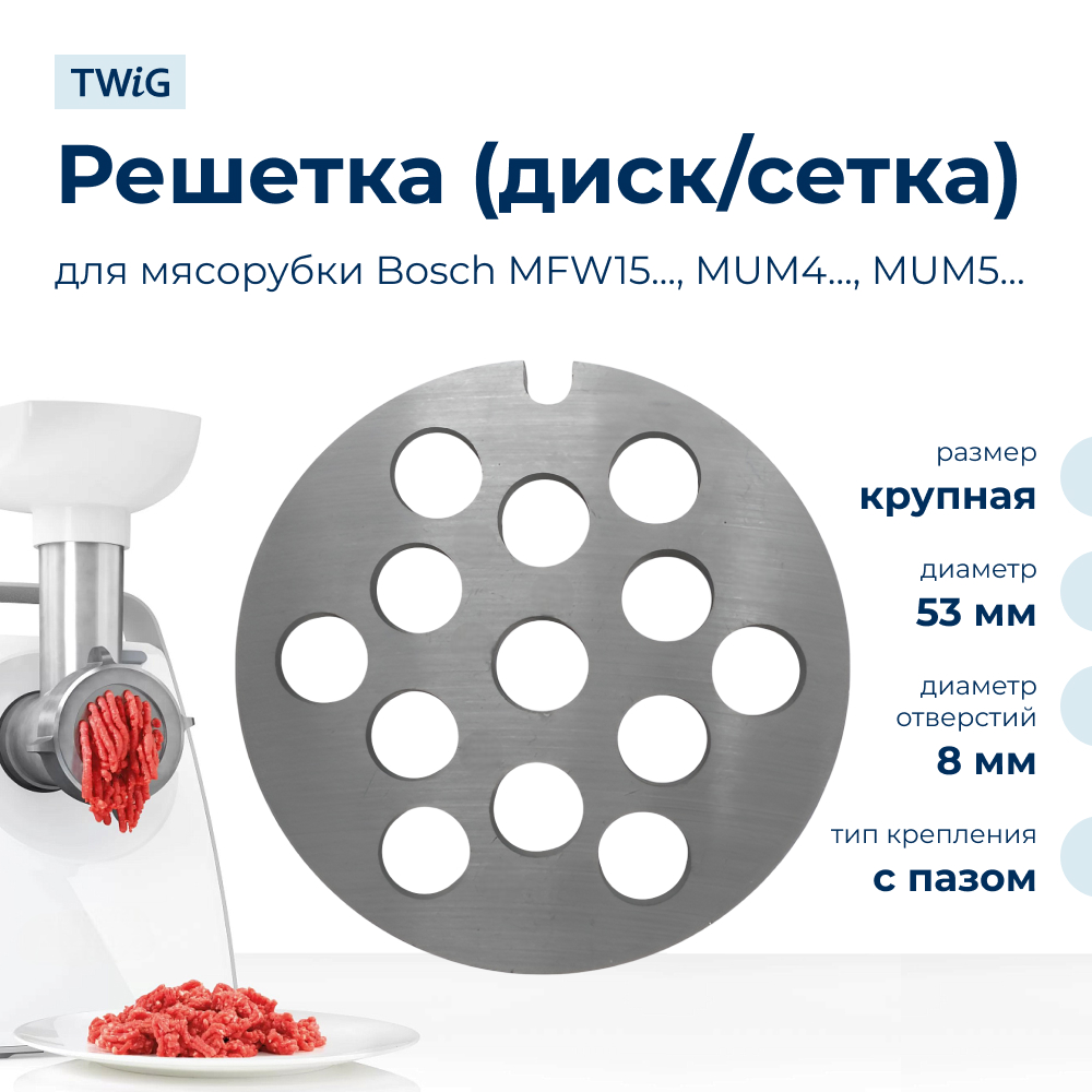 Крупная решетка для кухонных комбайнов Bosch с диаметром 53 мм и отверстиями 8 мм предназначена для измельчения мяса крупной фракции. Ее использование позволяет получить фарш с выраженной текстурой, который идеально подходит для приготовления колбас, люля-кебаб и мясных рулетов. Толщина 5 мм и нержавеющая сталь обеспечивают надежность и долговечность, а пазовое крепление гарантирует устойчивость при работе.