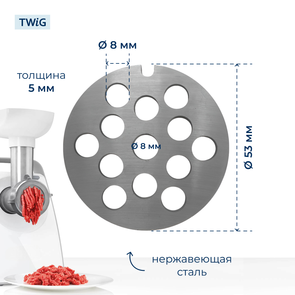 Решетка устанавливается после ножа, обеспечивая эффективное измельчение мяса. Крепление с пазом гарантирует надежную фиксацию в мясорубке, исключая смещение во время работы. Совместима с моделями: Philips HR7752/01, HR7754, HR7755/00, HR7756, HR7758/01, HR7765/13, HR7768/13.