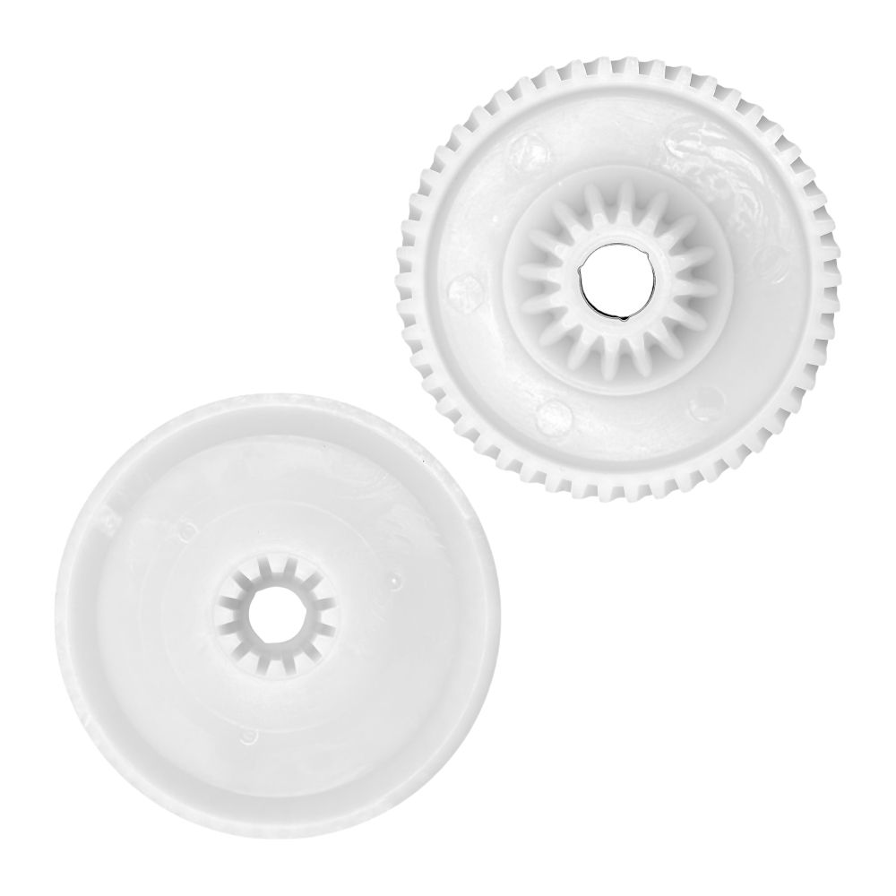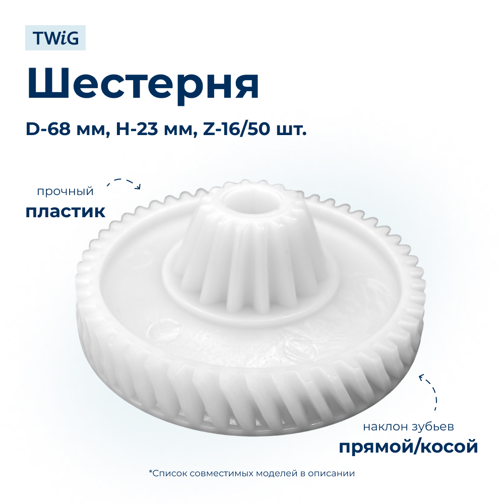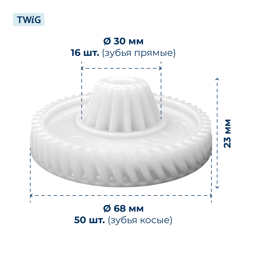 Наружный диаметр составляет 68 мм, высота — 23 мм. Конструкция включает 16 зубьев на малом диаметре и 50 на большом, обеспечивая надежное сцепление и эффективную работу редуктора. Зубья имеют смешанный наклон (прямой/косой), что повышает плавность хода механизма и снижает нагрузку на двигатель.